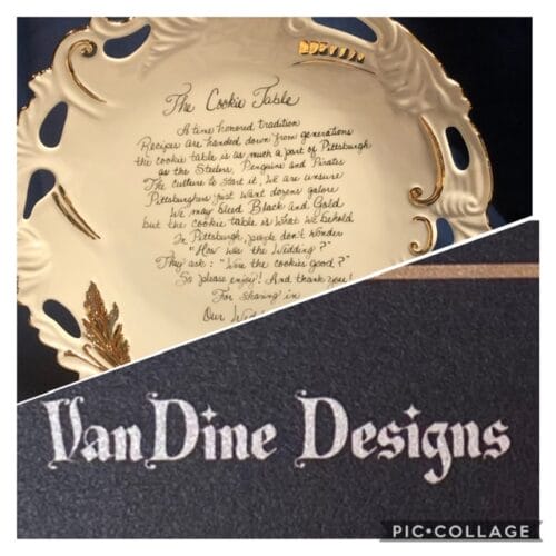 Hand painted porcelain wedding plates that are an elegant and beautiful addition to your cookie table. Each plate is hand painted with special ink and trimmed/decorated in gold then kiln fired. The story of the “Pittsburgh Cookie Table” can be displayed for everyone in attendance and then displayed in your home afterwards. It can be passed down to children and grandchildren as a family keepsake/ heirloom. Shipping available. I also make several trips a year back home to visit family and can meet near the Pittsburgh Airport area.